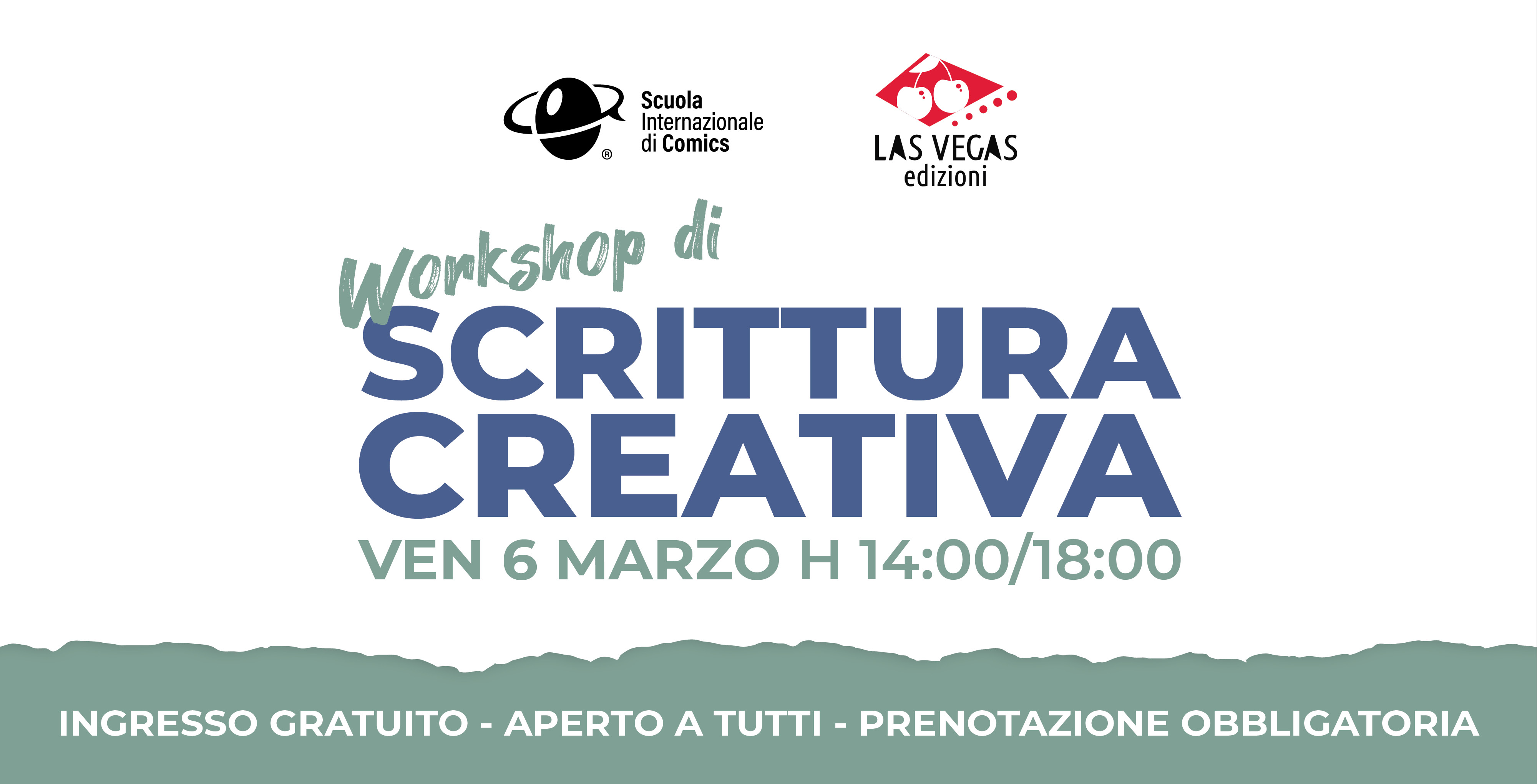 Il 6 Marzo, dalle 14:00 alle 18:00 apriamo le porte ad un workshop pratico di Scrittura Creativa a cura di Las Vegas Edizioni, Casa Editrice indipendente che da sempre valorizza voce, originalità e potenziale narrativo di ogni suo autore.