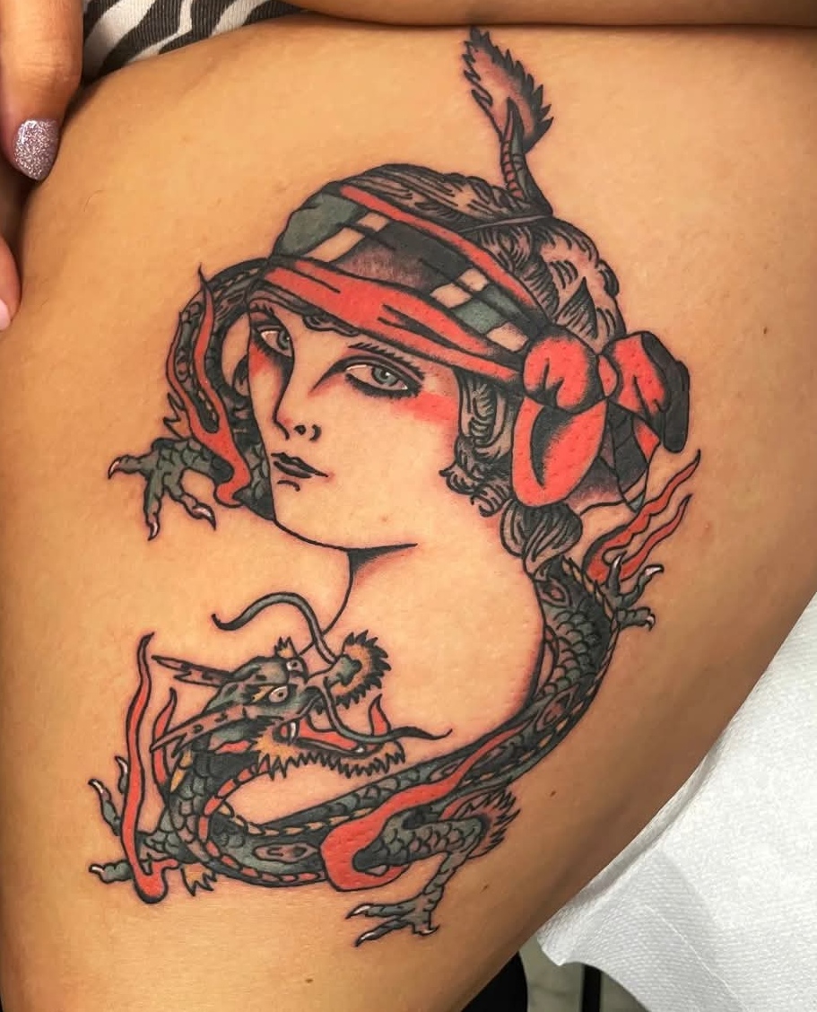 Romana, classe 1982, ha il suo primo incontro col tatuaggio frequentando gli ambienti punk della sua città e ne resta affascinata. Nel 2009 si trasferisce a Torino ed è lì che passa da semplice cliente ed appassionata ad apprendista in uno degli studi della città. Da quel momento inizia a fare maggiore esperienza, frequentando altri tattoo shop e tatuatori e iniziando a studiare il più possibile la storia dei flash iconici, delle reference, dei simboli in generale e del tatuaggio tradizionale in particolare. Pian piano si innamora sempre più e il tatuaggio diventa davvero la parte fondamentale e più importante della sua vita.